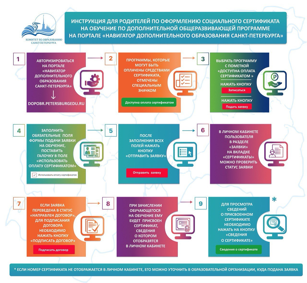 - родитель (или законный представитель) ребенка оформляет сертификат через портал «Навигатор дополнительного образования Санкт-Петербурга» https://dopobr.petersburgedu.ru;